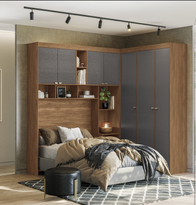 O Quarto Casal Floripa é um jogo de quarto de casal completo, um modulado que atende a espaços menores, com o maior aproveitamento de parede e o melhor custo/benefício. Possui um roupeiro de 3 portas de abrir com puxadores pontuais. Suas duas amplas gavetas internas deslizam sobre corrediças telescópicas de ótima qualidade. Os cabideiros são em alumínio, proporcionando muito mais espaço e qualidade no acessório onde são penduradas as roupas. Em uma das portas desse roupeiro pode ser colocado 02 espelhos de 95 x 25 cm. No módulo acima da cama podem ser acomodados os travesseiros, cobertores, roupas de cama… em suas 4 amplas portas, além de nichos para expor decoração. O espaço para colchão é de 1,38 m. No módulo lateral, tudo foi pensado para a maior comodidade de quem irá usar o móvel.