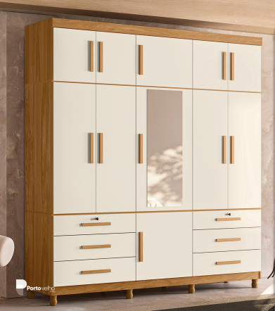 Guarda-roupa Casal com Espelho 11 Portas 6 Gavetas Otto Cinamomo / Off White