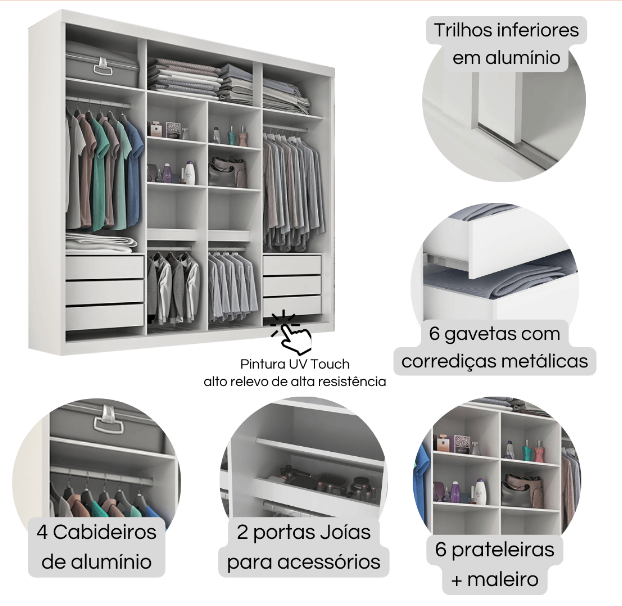 6 gavetas com corrediças metálicas, garantindo abertura suave;