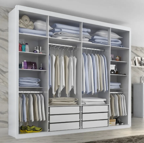 6 prateleiras e 4 cabideiros, otimizando o espaço interno;